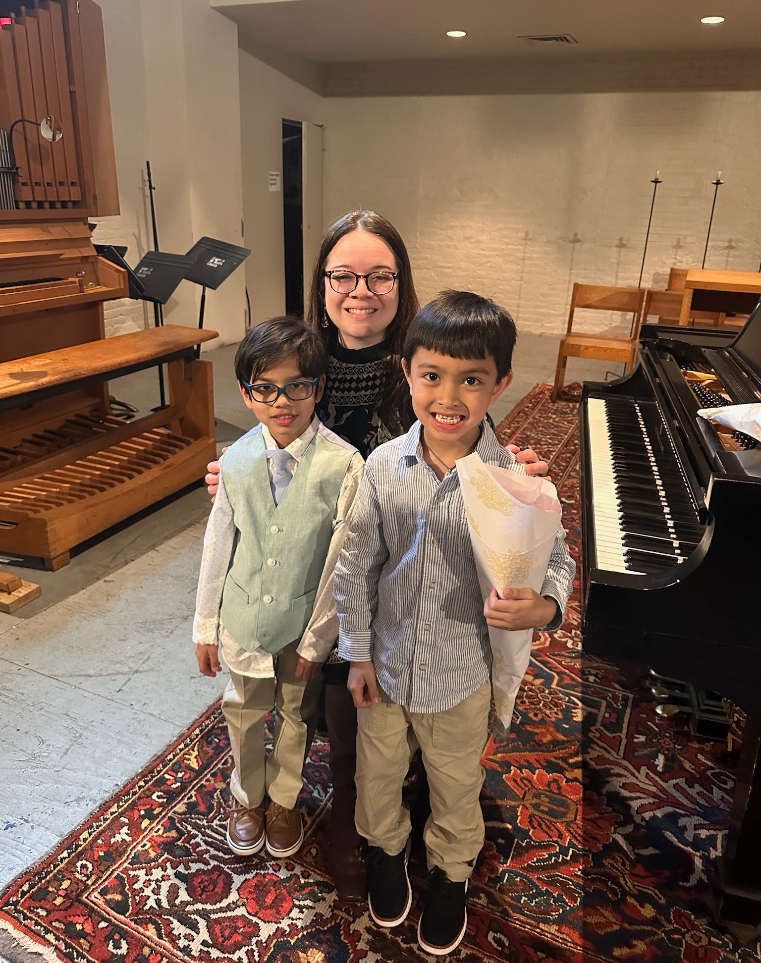“Alejandra is a fantastic, knowledgeable, professional, patient, and wonderfully present and graceful teacher and person. My children have been learning from Alejandra for the past 8 years. She has inspired in them a love for the instrument and the art form. She has also cultivated their knowledge for the music such that they can read and replicate music with confidence. Through the years, Alejandra has also been a source of support and a friend to my children. She is incredibly patient with them, translates the material in a manner they are able to absorb, and manages to push them with exactly the right amount of force so that they progress steadily without feeling forced. My children love playing the piano; this is truly a testament to Alejandra! I am so thankful to have her as an influence in their lives.”